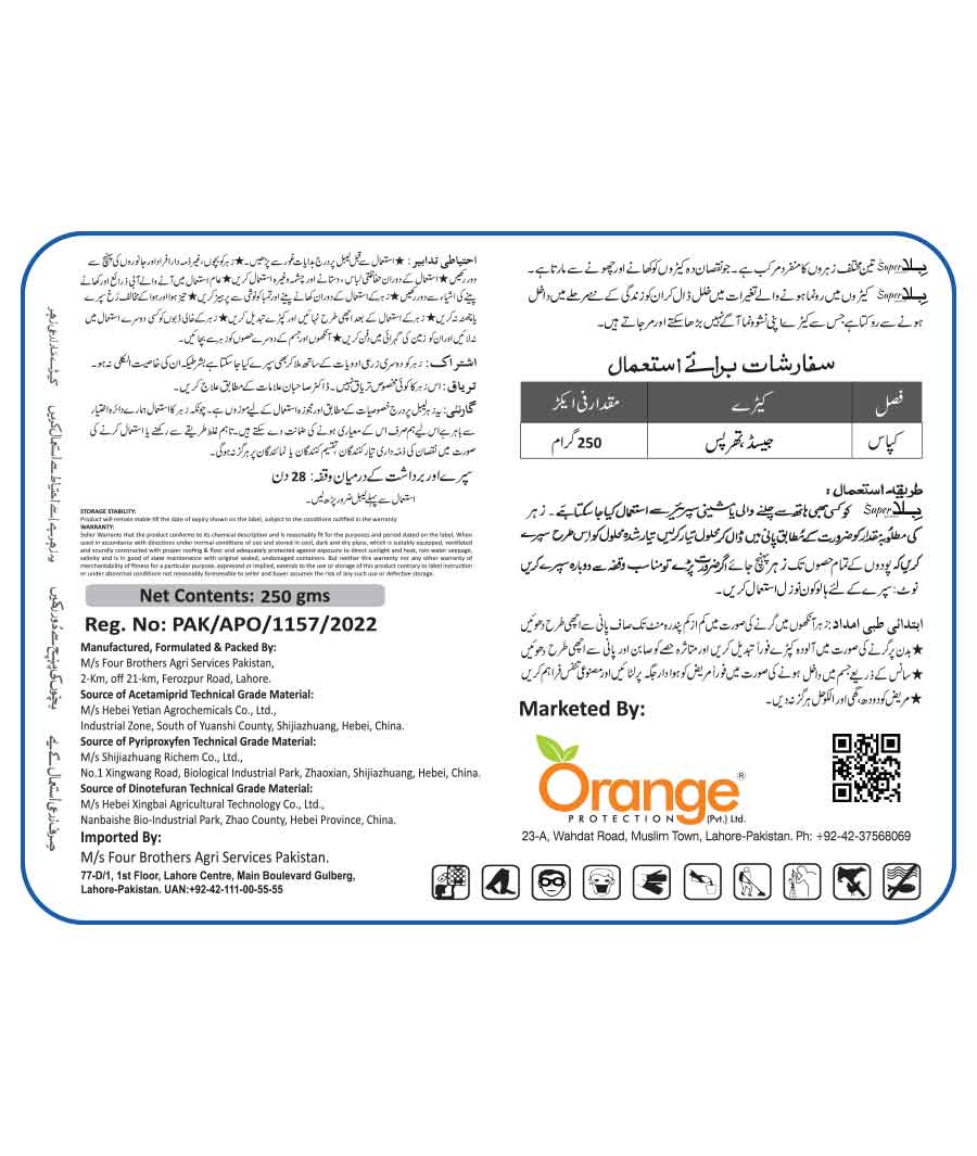 BILLA SUPER 51.6% WP is a potent insecticide blend, featuring a powerful combination of Acetamiprid, Pyriproxyfen, and Dinotefuran. This Wettable Powder (WP) formulation is engineered for optimal efficacy in pest control across various crops. With a unique composition, BILLA SUPER delivers a comprehensive solution against a wide range of pests. Acetamiprid acts as a neurotoxin, Pyriproxyfen disrupts the insect's growth and reproduction, while Dinotefuran targets the nervous system. This integrated approach ensures quick knockdown and lasting protection, making BILLA SUPER an indispensable tool for farmers seeking versatile and efficient pest management.